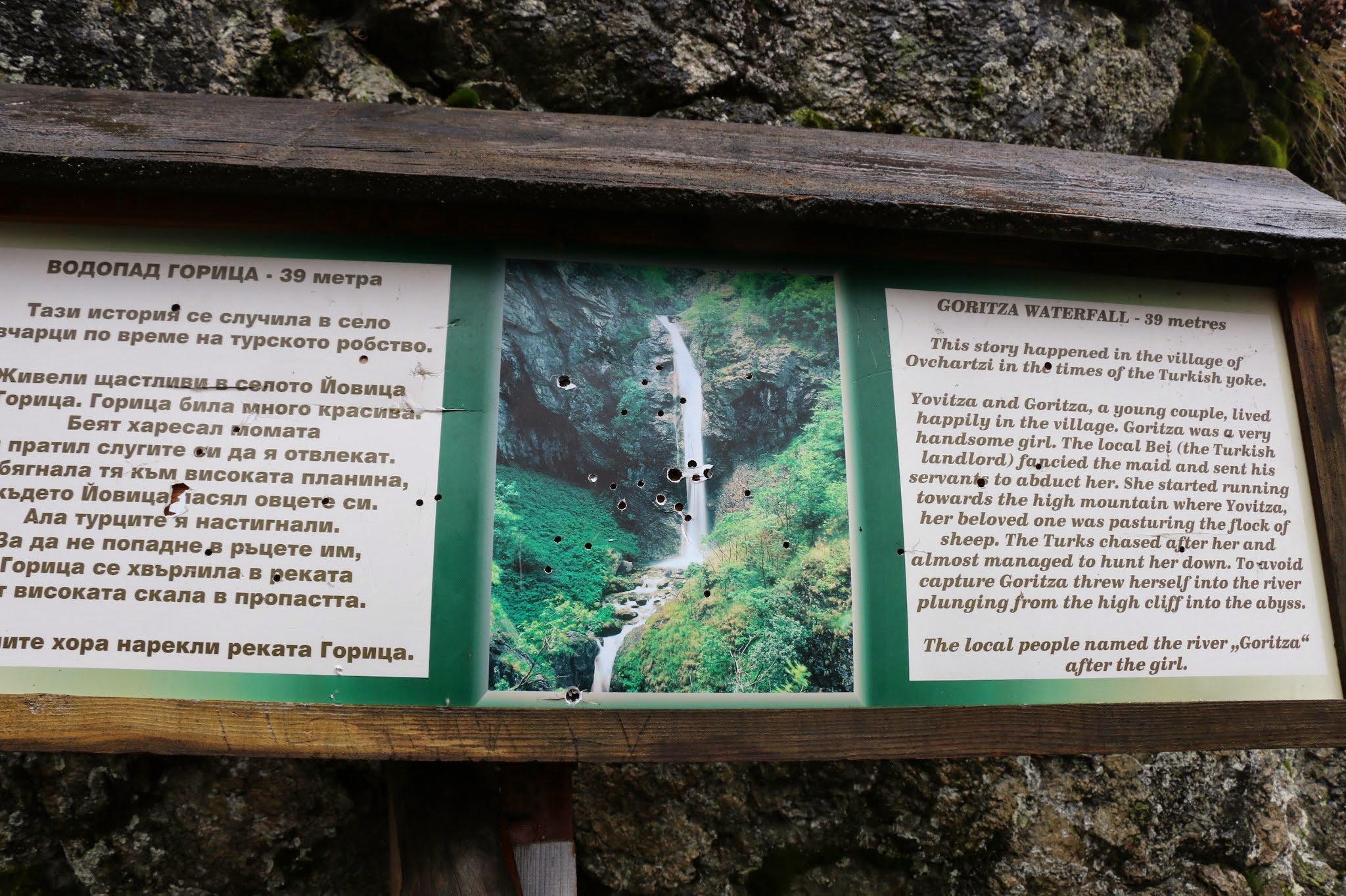 Според табелка, височината му е 39м и водата падаше на две нива. Макар и да беше на не повече от 30-40м от нас, водопада беше обхванат от мъглата. Нямаше достъп до него, затова направихме няколко снимки, прочетохме легендата за красавита Горица и обърнахме посоката. Мен не ме свъртя и се качих по една мокра и стръмна скала по нагоре, за да видя няма ли продължение тази т. нар. екопътека. Уви – нямаше. Всичко на всичко дължината и не е повече от 400м, така че ако общинарите искат да развият екотуризъм, ще трябва да запретнат ръкави и да я продължат. Никой няма да дойде тук, да се поразходи 400м до един водопад, колкото и красив да е.