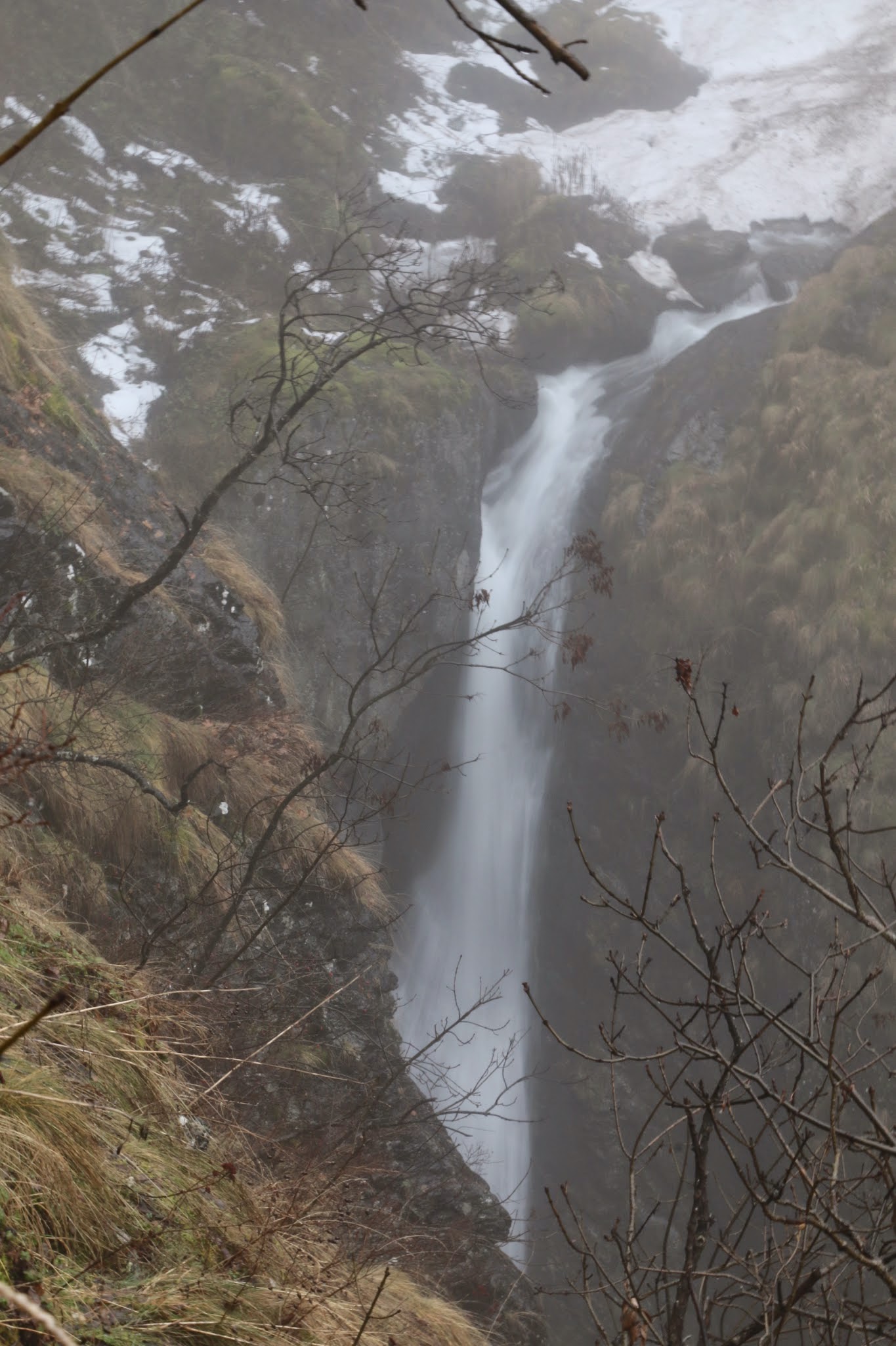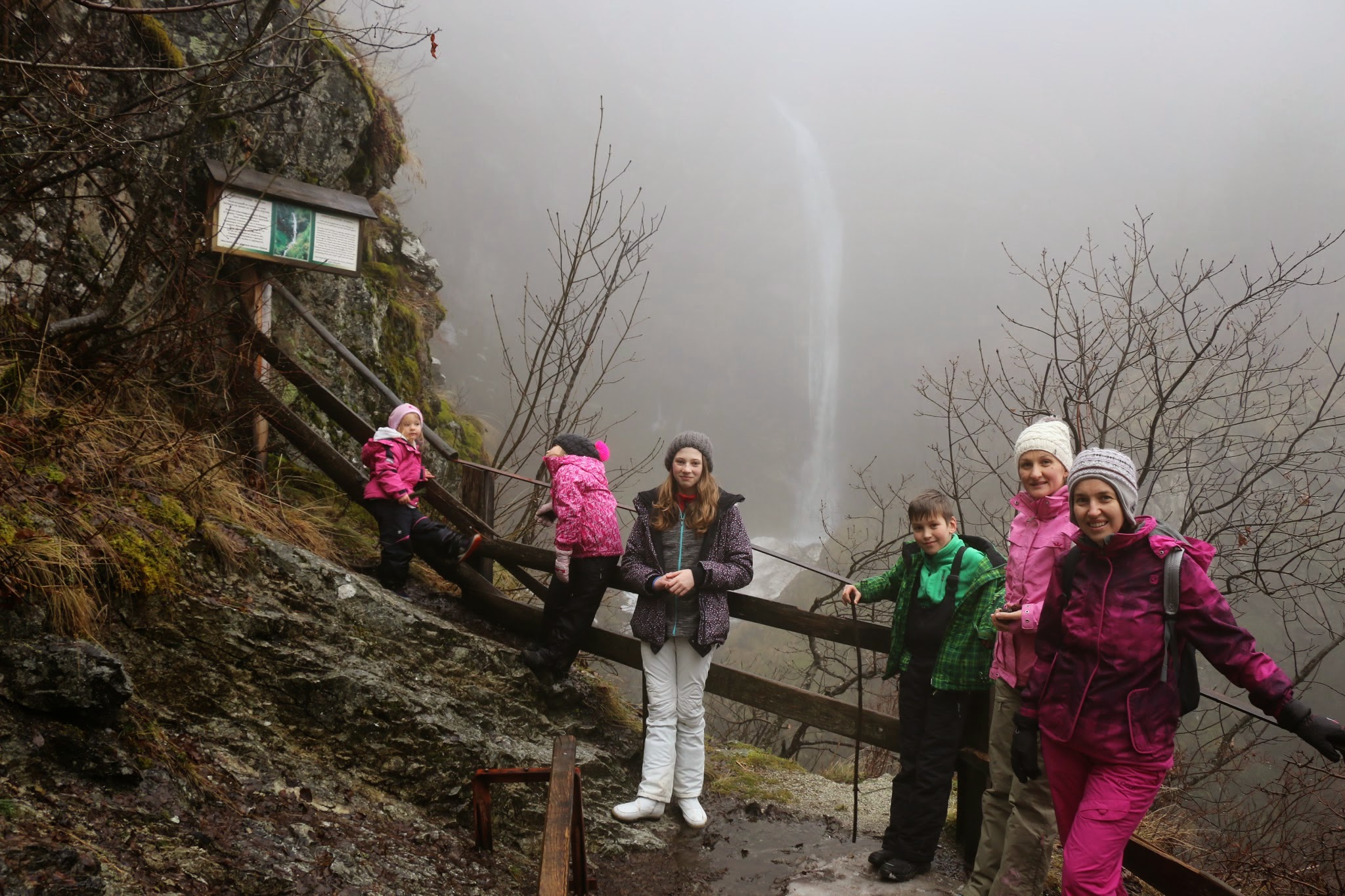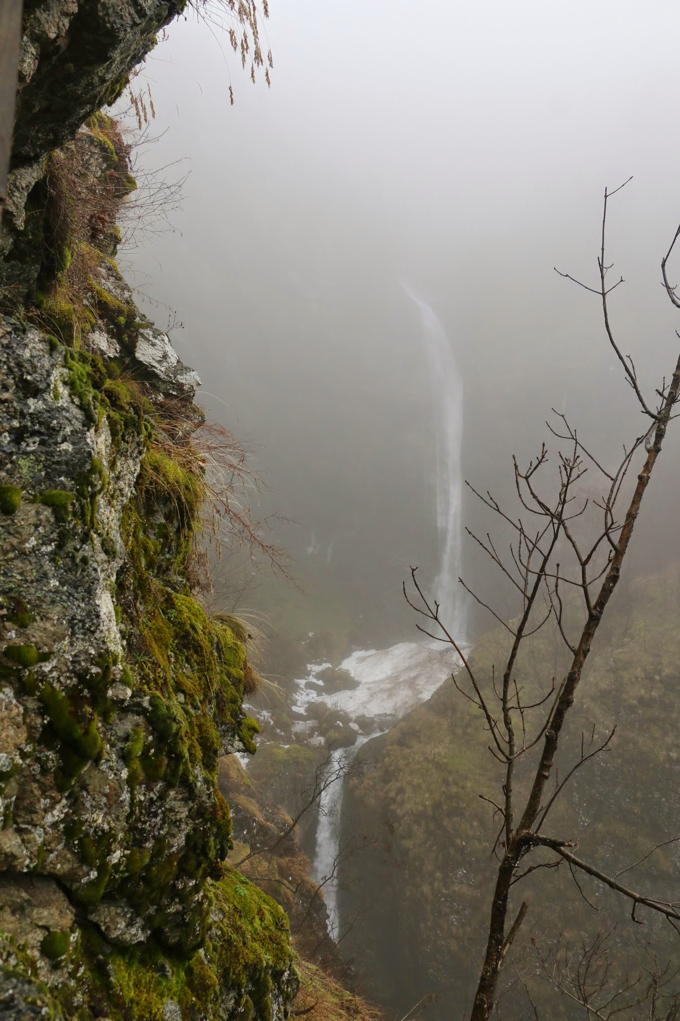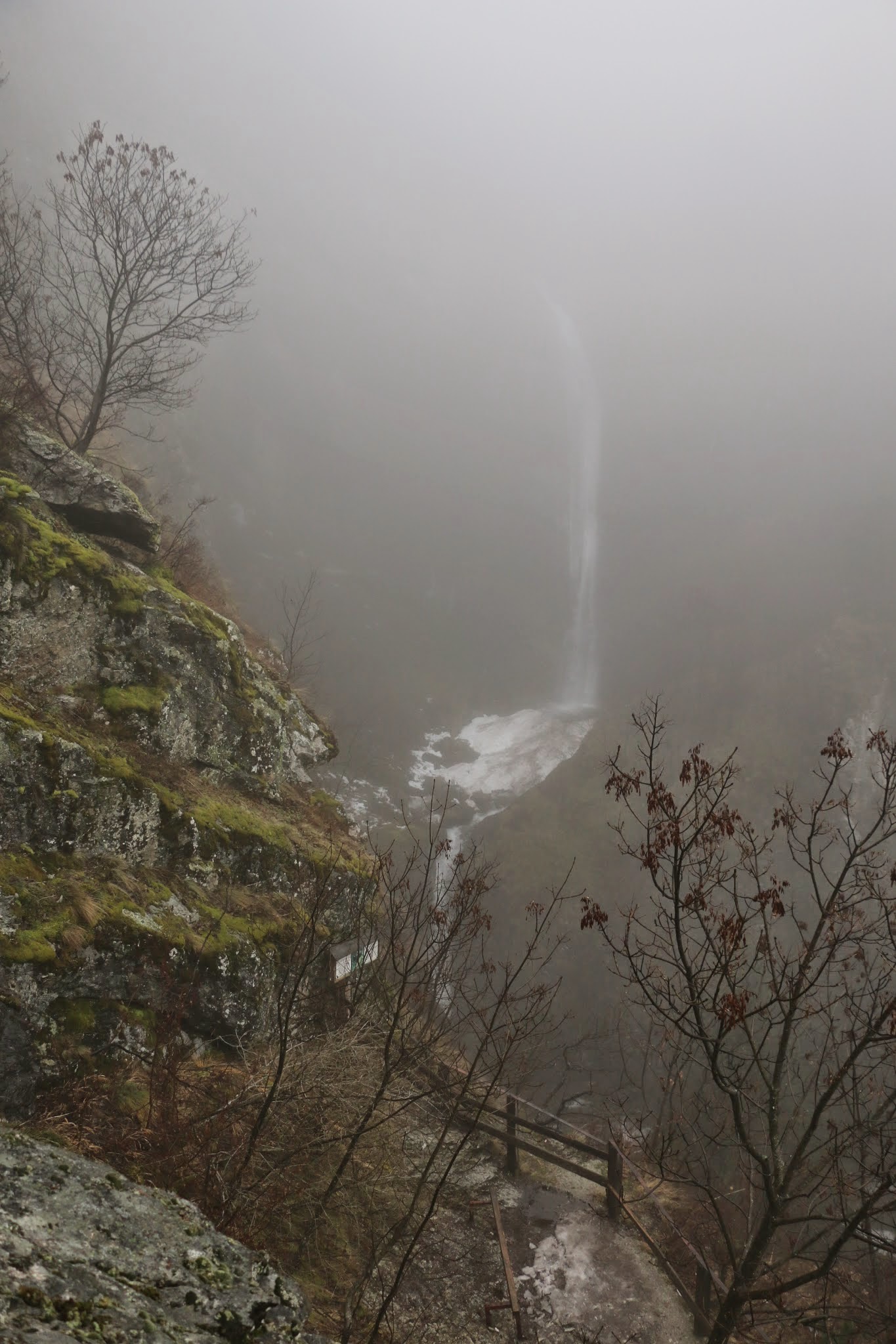 Само 50м след моста стигнахме малка площадка, от която се виждаше водопад… по скоро се чуваше и мъжделееше някъде сред мъглата.