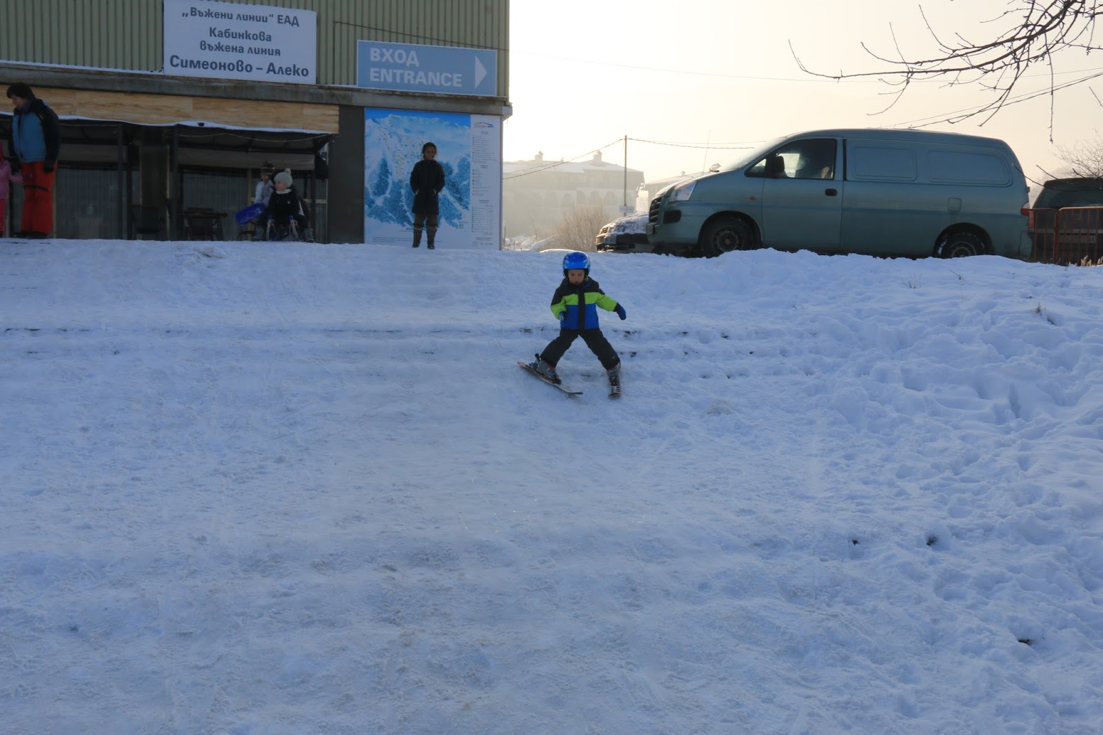 Пристигнали в Симеоново влязохме в първата кръчма да хапнем – беше вече около 14:00 и бяхме гладни и уморени. Заредихме батериите и поехме по поеслдния 1-1.5 км. към лифта. Нарекох го градско каране на ски, понеже се движехме по асфалтирани и черни пътища за коли.