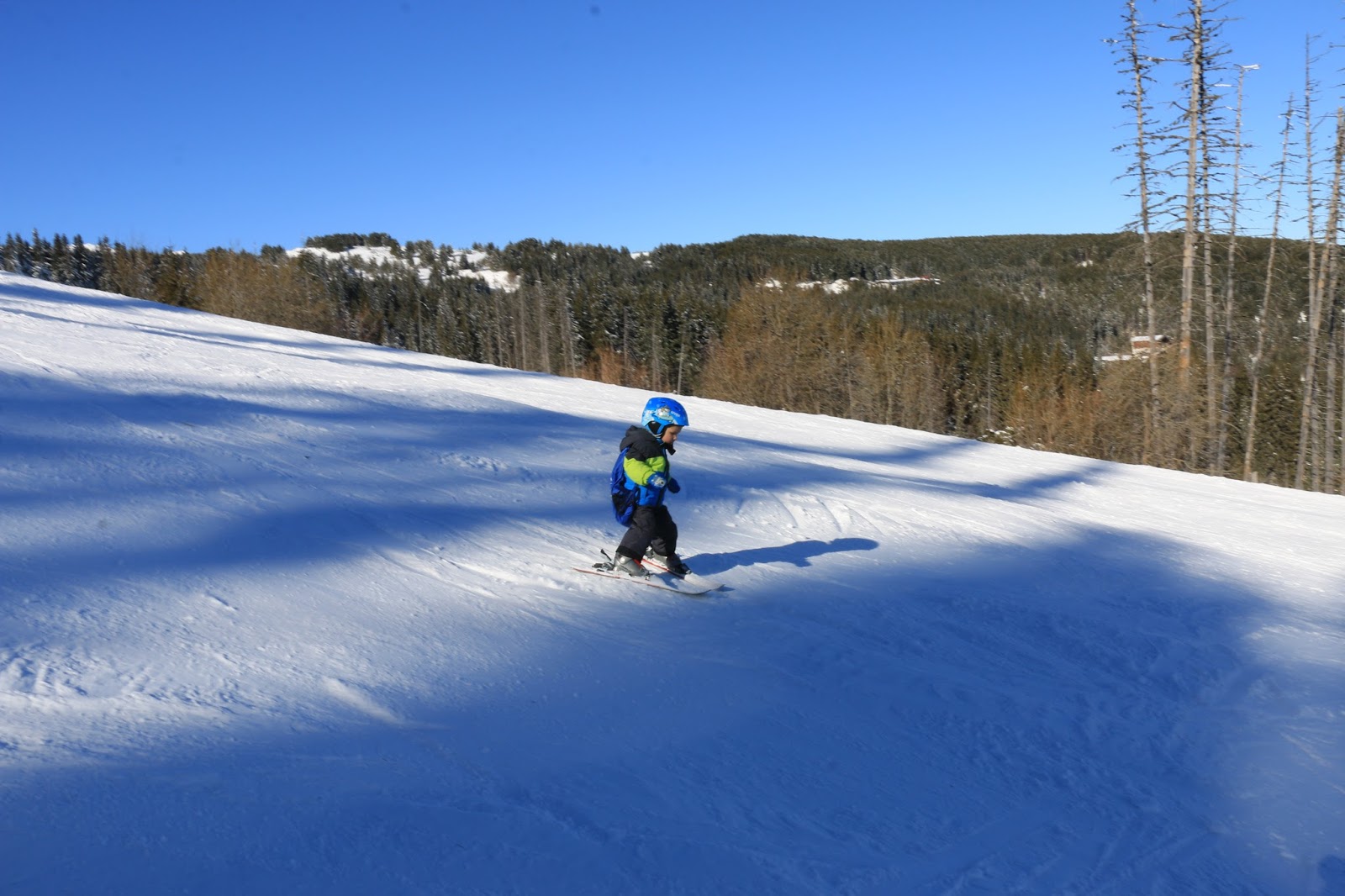 Отново умората при малкия скиор се прояви и от време на време го взимах в краката си. Но след кратка почивка отново искаше да кара сам. Ема се справяше като голям човек. Караше напред, спираше да ни изчаква и пак продължаваше.